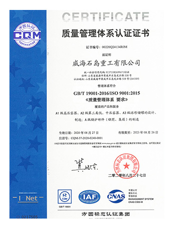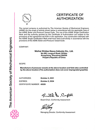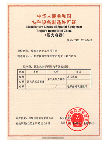 威海石島重工有限公司秉承了泰山集團悠久的鍋爐壓力容器制造經(jīng)驗,相繼取得了國家正式頒發(fā)的A1、A2、A3類壓力容器制造和設計許可證。隨著產(chǎn)品的外向發(fā)展,獲得了美國ASME認證。